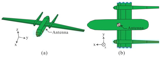 Figure 9a,b show a 3-D view and bottom view of the UAV model, respectively. The shape of the UAV is modeled to examine the performance of the proposed antenna mounted on the UAV. The UAV model consists of a fuselage and wings, and all surfaces are implemented as conductors. The size of the UAV model is similar to the size of a typical UAV. The proposed antenna is mounted on the bottom of the fuselage of the UAV and faces the—z-axis.