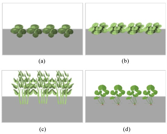 The phytoremediation treatment performed in the laboratory using (a) Lemna minor, (b) Salvinia minima, (c) Ipomea aquatica and (d) Centella asiatica.