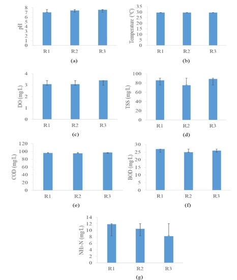 The average value of BOD recorded was about 26 mg/L. BOD represents the amount of dissolved oxygen needed by microorganisms in the aerobic process of the decomposition of organic matter. BOD was used as an indicator to determine the amount of organic pollutants in most aquatic ecosystems []. The permitted limit for BOD issued by the Department of Environment (DOE) in Malaysia is 50 mg/L. A low BOD value indicated a good quality, whereas a high BOD value indicated a contaminated water quality. Finally, the average content of NH3-N in the sewage sample was 10.20 mg/L. NH3-N is a common pollutant in a domestic wastewater which results from the degradation of nitrogenous organic matter. The degradation of organic matter in the biological treatment stage also produced a large amount of ammonia compounds []. The Environmental Quality (Sewage) Regulations 2009 has been revised by the DOE Malaysia, which significantly reduced the limit for the released of NH3-N from 50 mg/L to 5 mg/L. Sewage wastewater which contains high ammonia nitrogen will prevent the natural nitrification and reduce the water purification capacity and consequently endanger the water environment. Excess nitrogen released into the water body can contribute to eutrophication and rapid growth of algae, which results in a reduction of oxygen in water. Figure 2 shows the preliminary data on the water quality of sewage wastewater samples in this study.