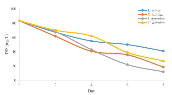 Phytoremediation treatment of sewage wastewater using Lemna minor, Salvinia minima, Ipomoea aquatica and Centella asiatica showed a decreasing in TSS reading (Figure 3). The average initial reading for TSS was 83.33 mg/L. On the second day of phytoremediation treatment, the TSS value was decreased to 67.33 mg/L, 61.67 mg/L, 68 mg/L and 70 mg/L for the treatment by Lemna minor, Salvinia minima, Ipomoea aquatica and Centella asiatica, respectively. On the final day of treatment, the TSS value in the treatment sample for Ipomoea aquatica recorded the lowest average reading, which was 12 mg/L, followed by Salvinia minima (18.67 mg/L), Centella asiatica (27 mg/L) and Lemna minor (41 mg/L). The reduction in the average reading for TSS was primarily due to the plants’ root systems. On that account, plants with fibrous roots were usually able to accumulate more TSS compared to those with taproot []. The root capacity increases with the growth of the plant, thus more suspended solids can be filtered []. Besides, a lower water flow also caused the increase in suspended solids and solids filtration by plant tissues.