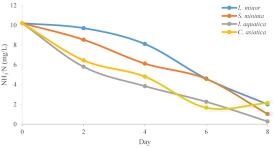 As for Salvinia minima, the results showed that after 8 days of treatment, this plant had reduced the content of TSS, NH3-N and COD by 77.6%, 89.9% and 82%, respectively. The ANOVA analysis conducted shows that there was a significant difference (p > 0.05) in the reduction reading of pollutants. Salvinia minima is a fast-growing aquatic fern which has high adaptability to various aquatic environments [,,]. Salvinia minima was able to accumulate pollutants in different physiological conditions, as it consists of floating leaves and a submerged leaves structure [,]. According to Olguin et al. [], their study indicated that Salvinia minima was more effective compared to Spirodela polyrrhiza in the phytoremediation of high-strength organic wastewater at a maximum initial NH3-N concentration of 70 mg/L and at a pH of 6.