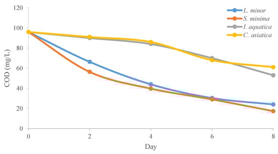 The graph of COD content reduction in sewage wastewater sample by phytoremediation treatment by Lemna minor, Salvinia minima, Ipomoea aquatica and Centella asiatica is shown in Figure 5. The average of initial reading for COD was about 96 mg/L. The reading of COD content was decreased on day 2 of treatment with the average value of 66.33 mg/L, 56.33 mg/L, 90 mg/L and 91 mg/L when treated with Lemna minor, Salvinia minima, Ipomoea aquatica and Centella asiatica, respectively. The average of final COD value was approximately 24 mg/L, 17.33 mg/L, 53 mg/L and 61 mg/L for the phytoremediation by Lemna minor, Salvinia minima, Ipomoea aquatica and Centella asiatica, respectively. The reduction in COD was obtained because the plants underwent the process of photosynthesis. The photosynthesis activity increases the dissolved oxygen in water, thus creating aerobic conditions in wastewater in favor of aerobic bacterial activity to reduce BOD and COD contents []. This can be an indication that wastewater would have a lesser impact on the environment after being treated using the phytoremediation method [].
