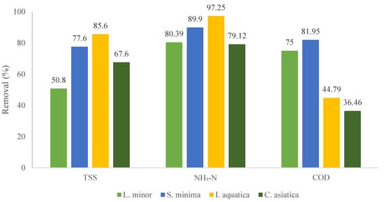 Based on the percentage of reduction as shown in Figure 5, it can be observed that Ipomoea aquatica was more efficient in reducing the contents of TSS and NH3-N, while Salvinia minima was more efficient in accumulating COD in the sewage wastewater sample. In a study conducted by Hanafiah et al. [], Ipomea aquatica was found to be more efficient than Centella asiatica by its ability to accumulate higher concentration of aluminum (Al) and iron (Fe). Nizam et al. [] found that Centella asiatica was the most efficient for NH3-N removal compared to Pistia stratiotes, Salvinia molesta, Ipomea aquatica and Eichhornia crassipes. It was indicated that each plant that acts as phytoremediation agent has its own efficiency rate in removing different pollutants. However, there are several factors that may affect the reduction percentage of contaminants, such as the type of pollutant and wastewater, treatment duration and pollutant concentration [,,].