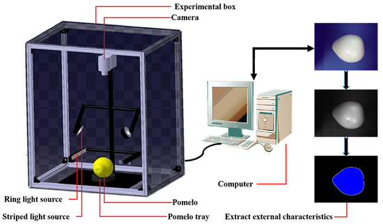 The camera was calibrated using a calibration board with 110 mm squares and the Computer Vision System Toolbox 8.1 in MATLAB software. Camera intrinsics and camera extrinsics were acquired. The Image Processing Toolbox 10.2 in MATLAB was used to extract fruit characteristics of pomelo, including pixel values for length and width. Pixel values were transformed into millimeter values based on the camera intrinsics and camera extrinsics [22], and these millimeter values for length and width were used to estimate volume and mass. Thus, the external characteristics of honey pomelo were estimated based upon the image information captured by the image acquisition system [23].