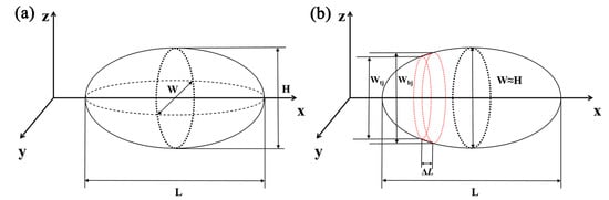 As shown in Figure 2, to better approximate the shape of the samples, the volume of the ellipsoid can be estimated by summing the volumes of an individual cone frustum [24]. The volume of each individual cone frustum and ellipsoid can be calculated using the following equations [21]: