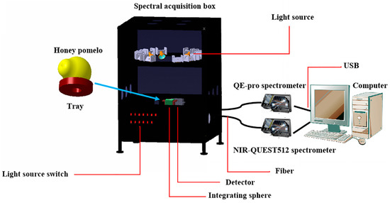 Two portable spectrometers were used to measure the visible and near-infrared transmittance spectral data of honey pomelo. As shown in Figure 3, these included a QE-pro spectrometer (ocean optics, United States) with an optical resolution of 0.14~7.7 nm, a signal-to-noise ratio of 1000:1; and a spectral range of 400~1100 nm, and a NIR-QUEST 512 spectrometer (ocean optics, United States) with an optical resolution of about 3 nm, a signal-to-noise ratio of 15,000:1, and spectral range is 900–1700 nm. The honey pomelo was placed on a tray and put in the spectral acquisition box. The tray under the samples helps maintain the fruit in a stable position without movement. Ten tungsten halogen lamps (lamp power set to 100 W, with the beam in direct contact with the sample) were installed in the spectral acquisition box. An integrating hollow sphere was used for the relative measurement of luminous flux and was set up in the middle of the bottom of the spectral acquisition box. This was evenly sprayed with a white diffusion layer in the inner wall, with a window of about 38 mm on the outer wall. Transmittance light can pass through the samples and the window, is reflected by the inner wall of the integrating sphere, and then emitted to the detector. The signal from the detector is determined by the luminous flux of the light source. The integrating sphere is connected to the detector, with two optical fibers, and the other end of the optical fiber is separately connected to each spectrometer. At the same time, the spectrometers were connected via USB to a computer.