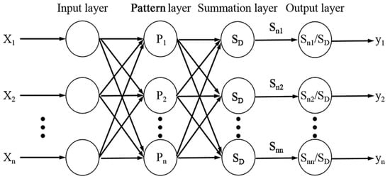 The number of neurons in the input layer corresponds to the dimension of the input vector in the learning sample. Each neuron is a simple distribution unit and is directly passed to the pattern layer according to the input variables, so the number of neurons in the pattern layer is equal to the number of input samples, since each neuron corresponds to a single sample. The transfer function of the neurons in the pattern layer is shown in Equation (8):