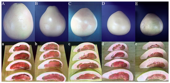External characteristics of honey pomelo: (A) Samples of Class A; (B) Samples of Class B; (C) Samples of Class C; (D) Samples of Class D; (E) Samples of Class E. Granulation levels of honey pomelo: (a) Samples of Class A; (b) Samples of Class B; (c) Samples of Class C; (d) Samples of Class D; (e) Samples of Class E.