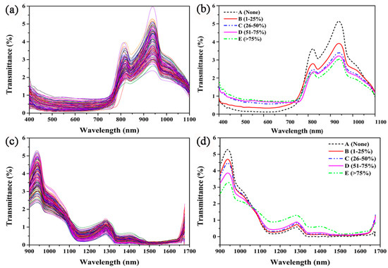 As shown in Figure 7a,b, within the visible spectral region (400–780 nm), no obvious absorption peaks were detected in the raw spectra and mean spectra. In the near-infrared spectral region, typical overlapping absorption peaks correspond to C-H, O-H, and N-H chemical bonds of water and carbohydrates in fruits [48]. In the short-wave near-infrared (SW-NIR) spectral region (780–1100 nm), an overlapping peak was detected at approximately 813 nm. The mean transmittance spectra of samples at 750–820 nm is related to the third and fourth overtone of C-H stretching vibrations and the first overtone of C=C stretching vibration [49]. The two spectrometers have overlapping regions of measurement (900~1100 nm), but because the instrument parameters are different, the peaks in this range are centered at 947 nm and 948 nm, corresponding to water absorption bands (O-H) [50].