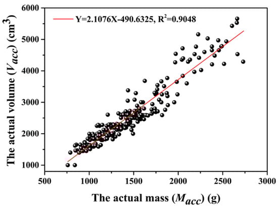 The actual mass (Macc) and the actual volume (Vacc) of all samples were determined and used to calculate the slope (k) and intercept (b) in Equation (5). By linear fitting analysis, k and b were determined as 2.1076 and −490.6325, respectively, with a coefficient of determination (R2) of 0.9048, as shown in Figure 8. The R2 value was close to 1, indicating a high correlation, with a high coefficient of determination between Macc and Vacc. Based on IIAS, V can be calculated by Equations (3) and (4). According to k, b, and V, M can be obtained by the application of Equation (6). The maximum, minimum, mean, and standard error values of mass (Macc and M) and volume (Vacc and V) are displayed in Table 2.