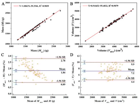 (A,B) Linear fitting analysis of mass (M and Macc) and volume (V and Vacc), respectively; (C,D) Bland–Altman plot of mass (M and Macc) and volume (V and Vacc), respectively.