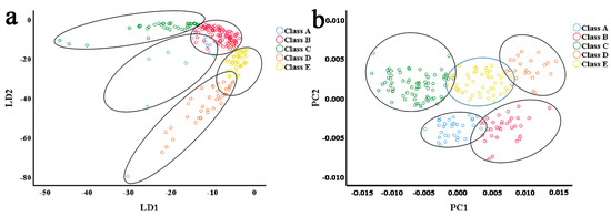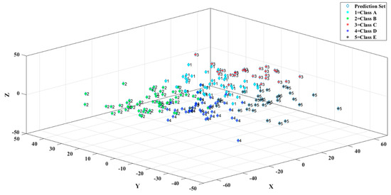The results from use of LDA to classify predicted samples are shown in Figure 10a. Class C obtained perfect classification. Eleven samples in Class A and Class B were mistakenly classified as other classes, so there was an intersection set between Class A and Class B. This also occurred for Class D and Class E. Excessive misjudgment of samples decreased the accuracy of sample classification except for Class C in LDA. Figure 10b shows the discriminant results of PCA-SVM for predicted samples for the five granulation levels. The predictive performance of PCA-SVM was superior to that of LDA, indicating more samples were accurately classified. For example, Class A and Class B together had only three samples incorrectly classified in the PCA-SVM model, which is obviously less than the number classified by LDA. However, using PCA-SVM, some Class E samples were misjudged as Class C and Class D, resulting in an intersection set of Class C and Class D with Class E. The distributions of samples in Figure 10a,b were consistent with the confusion matrix in Table 4.