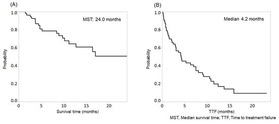 Overall survival (OS) (A) and time to treatment failure (TTF) (B) in patients with hepatocellular carcinoma (HCC) treated with lenvatinib. The median survival time (MST) and median TTF were 24.0 months and 4.2 months, respectively.
