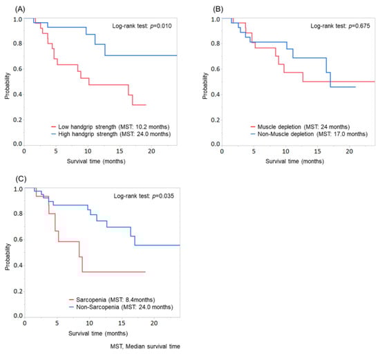Comparison of overall survival according to the evaluation of handgrip strength, skeletal muscle, or sarcopenia. (A) Patients with low handgrip strength showed significantly shorter survival than those with high handgrip strength (MST: low handgrip strength group, 10.2 months; high handgrip strength group, 24.0 months; p = 0.010). (B) No significant difference was found between patients with and without muscle depletion (p = 0.675). (C) Patients with sarcopenia showed significantly shorter survival than those without sarcopenia (MST: sarcopenia group, 8.4 months; non-sarcopenia group, 24.0 months; p = 0.035).