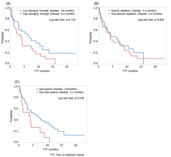 Comparison of time to treatment failure (TTF) according to the evaluation of handgrip strength, skeletal muscle, or sarcopenia. (A) Patients with low handgrip strength tended to discontinue the treatment than those with high handgrip strength (median TTF: low handgrip strength group, 3.6 months; high handgrip strength group, 6.2 months; p = 0.120). (B) No significant difference was found between patients with and without muscle depletion (p = 0.683). (C) Patients with sarcopenia showed significantly worse TTF than those without sarcopenia (median TTF: sarcopenia group, 3.6 months; non-sarcopenia group, 5.3 months; p = 0.036).