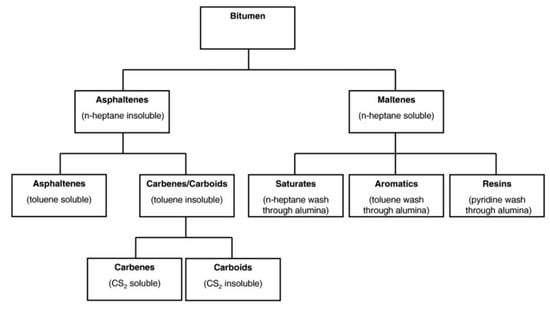 Bitumen separation into its various constituents, highlighting the SARA (saturates, aromatics, resins, asphaltenes) distribution, reproduced from [], Copyright Elsevier, 2020.