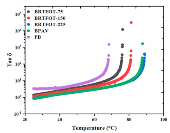 Figure 4 depicts the elastic modulus against temperature for all studied samples, in the temperature range 25 to 100 °C. In the temperature range 25–45 °C, the BRTFOT-75 and BRTFOT-150 binders had overlapped values, meaning their rigidity character is similar. At elevated temperatures, however, the aged binders showed higher values depending on their degree of ageing. For instance, PB had the lowest value in correlation with its tan value. After 60 °C for virgin bitumen and after 70 °C for aged binders, nonlinearity tended to appear in the trends, indicating the starting point of the TR region. When the elastic modulus is no longer detected, the transition process from viscoelastic to a liquid regime can be considered complete, and this proves that the liquid-like behavior increases with temperature.