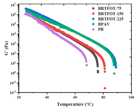 The below rheological plots illustrate consistent viscoelastic transition temperature (TR) trends among the binders (see Figure 3 and Figure 4). It is worth noting that at low temperatures, PB shows a higher phase angle value when compared with aged samples; this indicates that PB has lower rigidity. The TR for each of the studied aged binders increased with ageing, which implies an increase in hardness. The effect of ageing on pristine bitumen shifted the TR depending on the duration of ageing; for instance, the TR values of the most-aged binders, BRTFOT-225 and BPAV, increased by approximately 25 °C in comparison with the neat bitumen. The phase angle, tan, increased with temperature, signalling a reduction in material consistency, which means that the prevalent liquid-like character is inclined with temperature []. In order to have a clearer image of the bitumen TR range and the structural modifications, temperature-sweep experiments were plotted in terms of the elastic modulus G′. This experiment was conducted at a frequency of 1 Hz and at a constant heating rate (1 °C/min). The binder’s elastic modulus was observed continuously during a temperature ramp.