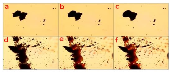 Optical microscopy (20×) images of PB (a–c) and PAV (d–f) asphaltenes at high temperature.