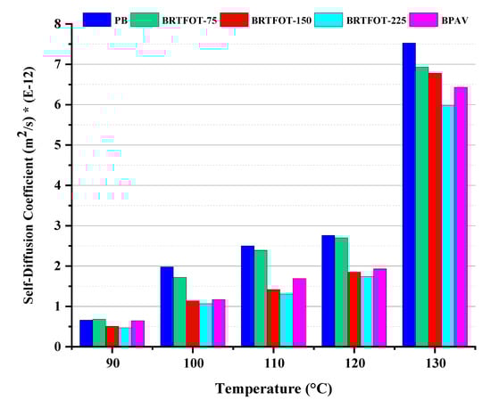 NMR self-diffusion coefficient characterization in the temperature range 90–130 °C for the different samples (PB, BRTFOT-75, BRTFOT-150, BRTFOT-225, and BPAV).
