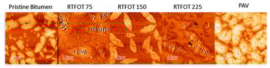 The AFM measurements in Figure 7 show that with increasing exposure time (RTFOT), the morphological structure of asphaltenes changes. More specifically, in the aged samples, we note the arising of progressively more oscillations in the AFM signal within each single cluster, a feature which is known as “bee structure” [] and which denotes structuring of asphaltene clusters at the micrometer-length scale []. Moreover, the asphaltene domain size increased with ageing time. For instance, at BRTFOT-225, the domains were about 10 microns in length and 5 microns in width; the AFM image of PAV bitumen instead revealed asphaltene domains smaller than those observed in BRTFOT-225, homogeneously dispersed on the sample surface.