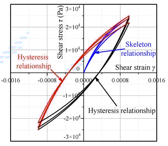 where , and are fitting parameters of the model. To intuitively illustrate this model, its dynamic shear stress–shear strain curves are plotted in Figure 5, taking as an example.