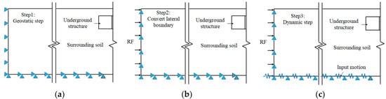 Transformation of boundary condition during analysis: (a) geostatic step; (b) convert lateral boundary; and (c) dynamic step.