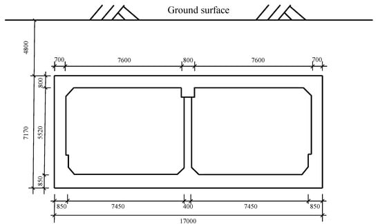 Given the established measurement system, Daikai station was adopted as a typical example [38] to demonstrate the seismic-vibration mitigation effect and the feasibility of the proposed NSAS isolation system. The obtained effectiveness and design can be used as guidelines for other typical underground structures with similar and more complex typologies. Daikai station was severely damaged during the 1995 Great Hanshin earthquake [4]. It is a typical two-span subway station with a cross-section, displayed in Figure 8. The dimensions of the central column are 0.40 × 1.0 m, and the space between central columns is 3.5 m. The density, Poisson’s ratio and Young’s modulus of the structural concrete in this model were 2500 kg/m3, 0.20 and 30 GPa, respectively. The initial compression yield stress, initial tensile yield stress and limited compression yield stress of the concrete material were 18.8, 2.4 and 26.8 MPa, respectively [11].