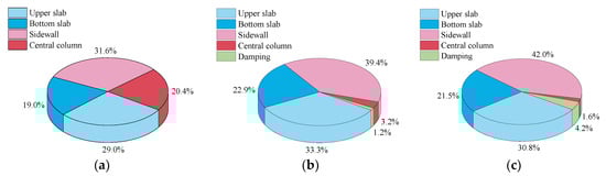As a robust evaluation index for this type of seismic excitation [42,43,44,45,46], energy-dissipation distributions between different components of an uncontrolled underground structure and structures with a CIS or the NSAS isolation system are shown in Figure 15. Since the central column of the Daikai subway station was severely damaged in the uncontrolled structure, after the installation of the CIS and NSAS isolation system the proportion of energy dissipated by the central column was decreased from 20.42% to 3.18% and 1.61%, respectively. At the same time, the dissipated energy by the wall-slab structures (upper slab, bottom slab and sidewall) was increased by a small amount in the acceptable range. Quantitively, the maximal plastic-energy densities (plastic-energy dissipated by the unit volume of the structure) of the different structural components are listed in Table 6 in order to characterize the degree of unwanted damage. The maximal plastic-energy density of the central column was decreased from 2221 (uncontrolled) to 210 (CIS) and 138 J/m3 (NSAS isolation system). Benefitting from the energy-dissipation mechanism of the NSAS, the proposed NSAS isolation system undertook a heavier energy-dissipation burden to ensure the more effective protection effect of the central column. Particularly, the energy-dissipation proportions of the dashpots of the NSAS isolation system and CIS were, respectively, 4.2% and 1.2%. The NSAS isolation system proposed in this study had a better energy-dissipation effect than that of a conventional seismic-vibration control system. For the wall-slab structures, an increase of about 20% in maximal plastic-energy density was observed, which cannot significantly affect the seismic performance of wall-slab structures [10].