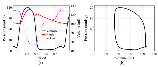 Figure 8a shows the input volume waveform of the ventricular pump. In the early systolic period, it is compressed with a biased sine wave, and in the late diastolic period, it expands with constant velocity. Systolic is 30% of the total cycle period.