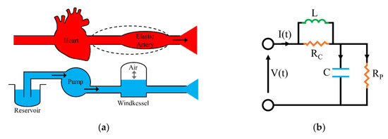 Figure 2a. The windkessel means air chamber in German, and is an air-spring type capacity mounted in the middle of the pipe to control the flow rate. The combination of air-spring effect and peripheral resistance in the windkessel can reproduce the properties of the elastic artery wall. The fluid dynamics model of the cardiovascular system lumped with the windkessel effect is called the windkessel model, which can be converted into an equivalent electrical circuit through fluid–electric analogy [