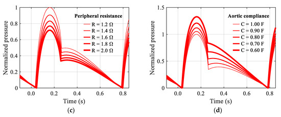 Figure 7b shows the normalized aortic pressure according to peripheral resistance. As a result, as the peripheral resistance increases, the pulse pressure, which is the amplitude of the aortic pressure waveform, decreases.