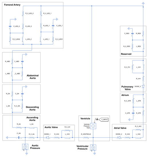 Figure 6 shows the simulation model of the mock circulatory platform obtained from the same fluid–electric analogy applied to a simple model in