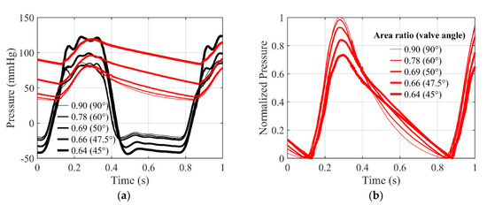 Figure 8b, and shifted to have zero as the minimum value. As the valve angle decreases, the area ratio decreases and the peripheral resistance increases. At the same time, it can be seen that the pulse pressure decreases. This is consistent with the change in pulse pressure according to the peripheral resistance predicted through the simulation model of