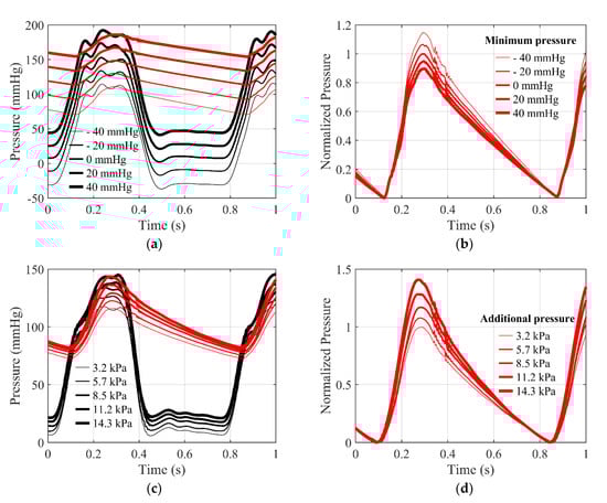 Figure 10d shows a normalized aortic pressure waveform. To compare the pulse pressure, measured aortic pressures were normalized to the baseline aortic pressure in