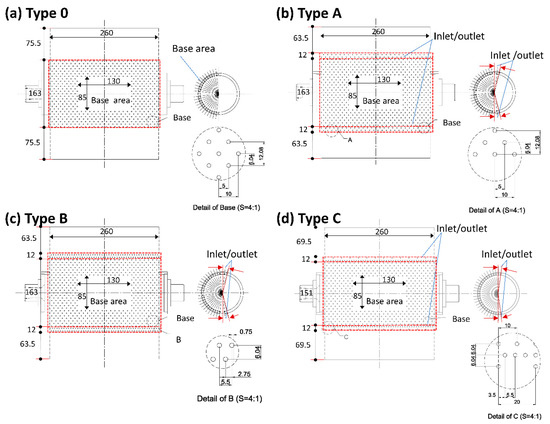 Candidate air-bar designs for the FSI simulations. (a) Type 0 is the base design with a 180-degree hole distribution with a density of 0.026. (b) Type A is an alternative design based on Type 0, with additional holes at the inlet and outlet with a density of 0.026 in two rows. (c) Type B is an alternative based on Type 0, with additional holes at the inlet and outlet with a density of 0.094 in two rows. (d) Type C is an alternative based on Type 0, with additional holes at the inlet and outlet with densities of 0.052 and 0.013 in two rows, respectively.