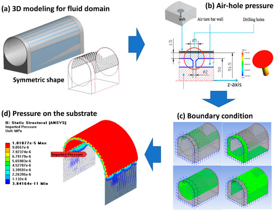 Summary of the FSI analysis protocol: (a) three-dimensional (3D) modeling of the symmetrical air bar, (b) determining the pressure at the air hole, (c) boundary conditions for the fluid simulations, and (d) the pneumatic pressure acting on the substrate induced by the air flow.