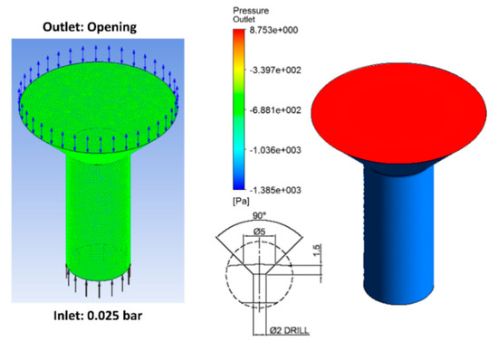 The simulation procedure is summarized as follows: The air bar was modeled in three dimensions using CAD software. It had a symmetric shape in the longitudinal direction, and so only half of the real air bar was modeled in order to make the analysis more efficient and rapid (Figure 2a). The pressure at an air hole was determined, as shown in Figure 2b, while the detailed design of the hole is illustrated in Figure 3. The hole diameters at the inlet and outlet were 2 mm and 5 mm, respectively, and the spreading angle of each hole outlet was 90 degrees. A pressure regulator was employed to supply a constant pressure to the air bar, and so the inlet pressure was assumed to be constant, at 0.025 bar in these simulations. The pressure at the hole outlet was calculated as 8.753 Pa under the given geometric parameters (Figure 3). The flow in the nozzle was assumed to be a laminar flow, thus the pressure was uniform and changed at the top of the nozzle.
