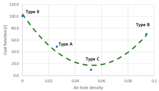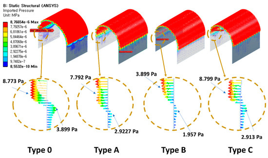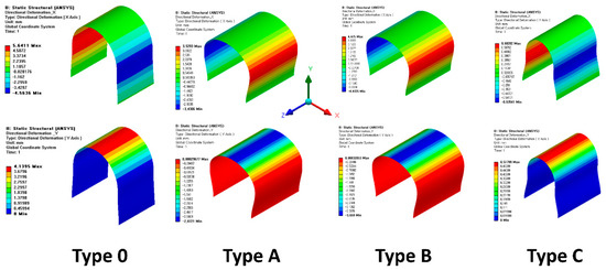 A structural analysis of the floating substrate was used to investigate the deformation between the inlet and outlet and the middle area due to the induced pressure distribution. The two sorts of deformation were depicted along the x-axis for the inlet and outlet and along the y-axis for the middle area (Figure 5). Table 1 summarizes the deformation and pneumatic pressure of the substrate. Among Types 0, A, and B, the increased air-hole density of the additional rows decreased the negative pressure, while the variation in the deformation increased. Therefore, the alternative design of Type C was employed with air-hole densities of 0.052 and 0.013 for the two rows, which represented an intermediate design between those of Types A and B. The inlet and outlet pressures for Type C were similar to those for Type A, but the difference in the deformation was decreased by more than five-fold. The following cost function (J) was proposed (each design is illustrated in Figure 6) [21]