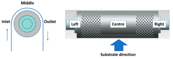 In order to verify the optimal design of the air bar proposed in the previous section, we manufactured a prototype based on the design of Type C and equipped it in the drying and sintering section, as shown in Figure 7. The tension in the substrate cannot be controlled due to the registration in the drying section of the R2R process [22,23]. The testing platform for the R2R process comprising unwinding, printing, drying, cooling, and rewinding has been described in detail for our previous study [17].