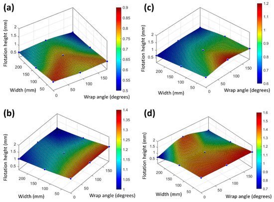 Measured flotation heights as a function of operating velocity and blower frequency. A width of 0 mm refers to the right area and a wrap angle of 0 degrees refers to the inlet. The velocity and blower frequency were respectively (a) 10 m/min and 25 Hz, (b) 10 m/min and 35 Hz, (c) 15 m/min and 25 Hz, and (d) 15 m/min and 35 Hz.