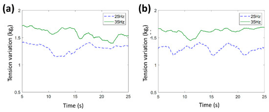 Measured tension in the substrate for blower frequencies of 25 Hz and 35 Hz at operating velocities of 10 m/min (a) and 15 m/min (b).