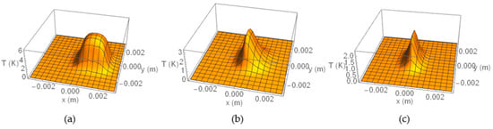 T(x,y,0,τ) calculated for a τ = 1 s burst produced by squared (w = h = 2 mm) heat sources buried d = 0.1 mm below the surface and emitting a flux of 10 kW/m2. Three inclinations are considered: (a) φ = 0°, (b) φ = 30°, (c) φ = 90°. Note the different temperature scales in the three figures.