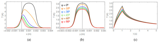 As the inclination of the heat source has the direction of the OX-axis, the surface temperature distribution is mostly affected in this direction. To illustrate this, in Figure 3a,b we present surface temperature profiles along the OX- and OY-directions, T(x,0,0,τ) and T(0,y,0,τ), respectively, produced by heat sources of the same dimensions, depth, flux, and burst as in Figure 2, for six different inclinations φ = 0°, 10°, 30°, 45°, 60°, 90°. As pointed out in Figure 2, the OX-profiles are asymmetric, except for the horizontal (φ = 0) and vertical (φ = 90°) heat sources although, according to the geometry depicted in Figure 1, the former is displaced with respect to the origin. The inclination does not significantly affect the shape of the OY-profiles, which remain symmetric.