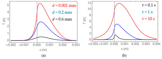 According to the previous results, we can infer that the inclination of the heat source affects mainly the shape of the temperature distribution along the OX direction, featuring an asymmetry. However, the evidence of this signature depends on the depth d of the heat source and the duration of the burst, τ. As an example, Figure 4a displays OX profiles calculated at the end of a τ = 1 s burst, T(x,0,0,τ), produced by a squared heat source of the same dimensions (w = h = 2 mm) and flux (Φ = 10 kW/m2) as in Figure 3, that makes an angle of φ = 20° with the surface, for three different depths, d = 0.001, 0.2, and 0.6 mm. We can see that, as the depth increases, not only the signal diminishes, but also the curve is smoothed out, making the identification of the angle more difficult. In Figure 4b we illustrate the dependence of OX-profiles with the duration of the burst. We show T(x,0,0, τ) corresponding to a heat source buried d = 0.01 mm, with the same geometry and heat flux as in Figure 4a, calculated at the end of three different bursts, τ = 0.1, 1, and 10 s. For this geometry, the deepest side of the rectangle is buried dmax = 0.69 mm below the surface.