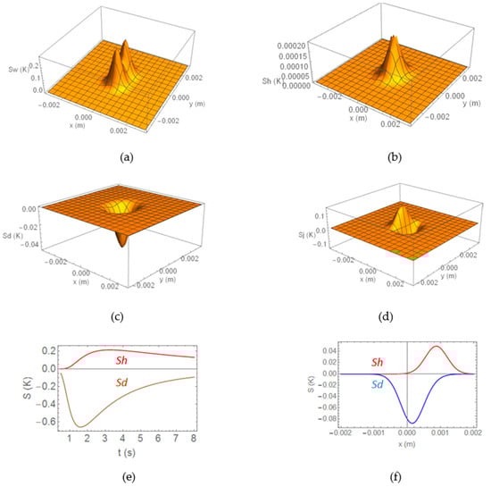 Sensitivity of the surface temperature distribution at the end of the burst calculated for a τ = 0.5 s burst and a squared (w = h = 1 mm) vertical (φ = 90°) heat source buried d = 0.5 mm below the surface, emitting a flux of 40 kW/m2. (a) Sensitivity to the width Sw, (b) sensitivity to the height Sh, (c) sensitivity to the depth Sd, and (d) sensitivity to the angle Sφ. (e) Sensitivity of the temperature evolution at the origin to the height Sh (red) and to the depth Sd (brown). (f) Sd (blue) and Sh (red) along the OX-axis for a heat source of the same dimensions and depth and τ, but making an angle of φ = 30° with the surface.