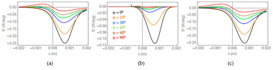In Figure 6a, we represent S’ along the OX-axis at the end of a τ = 5 s burst (μτ = 1.6 mm) for the same standard heat source (w = h = 1 mm) buried d = 0.5 mm below the surface emitting a flux of Φ = 40 kW/m2, and several inclinations, namely, φ = 0°, 10°, 30°, 45°, 60°, and 90°. For φ = 90°, the maximum depth of the heat source is dmax = 1.5 mm, of the same order as μτ.