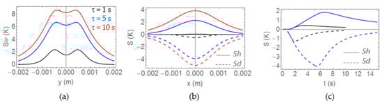 Increasing the duration of the excitation τ increases the sensitivity to the rest of the parameters, as well. In Figure 7a,b we display sensitivities (original definition in Equation (12)) of the temperature distribution at the end of the burst along the coordinate-axes to the magnitudes featuring the most significant variation along each axis (see Figure 5a–d): OY profile for Sw (Figure 7a) and OX profiles for Sh, Sd (Figure 7b). In all cases, w = h = 1 mm, d = 0.3 mm and φ = 90° (dmax = 1.3 mm), and we represent three bursts, namely, τ = 1 s (μτ = 0.72 mm, black), τ = 5 s (μτ = 1.6 mm, blue) and τ = 10 s (μτ = 2.3 mm, red). Figure 7c displays Sh and Sd of the timing graph at the origin, T(0,0,0,t) for τ = 1 and 5 s.