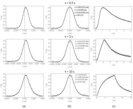 (a) T(x,0,0,τ), (b) T(0,y,0,τ), and (c) T(0,0,0,t) corresponding to a square heat source (w = h = 1 mm) buried d = 0.5 mm, and making an angle φ = 45° with the surface calculated for three bursts τ = 0.5, 2, and 10 s, with added noise (symbols) and fittings of Equations (10) and (11) (solid lines). SNR = 60 in all cases. Best fit parameters and standard deviation indicated in Figure (b).