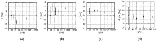 As an illustration, in Figure 9 we present best fit parameters and standard deviations corresponding to the same heat source as in Figure 8 (w = h = 1 mm, d = 0.5 mm, φ = 45°), excited with a τ = 5 s burst, obtained from data featuring different values of the SNR. For this τ, the thermal diffusion length associated to the end of the burst, μτ = 1.6 mm, largely covers the maximum depth of the heat source dmax = 1.2 mm.